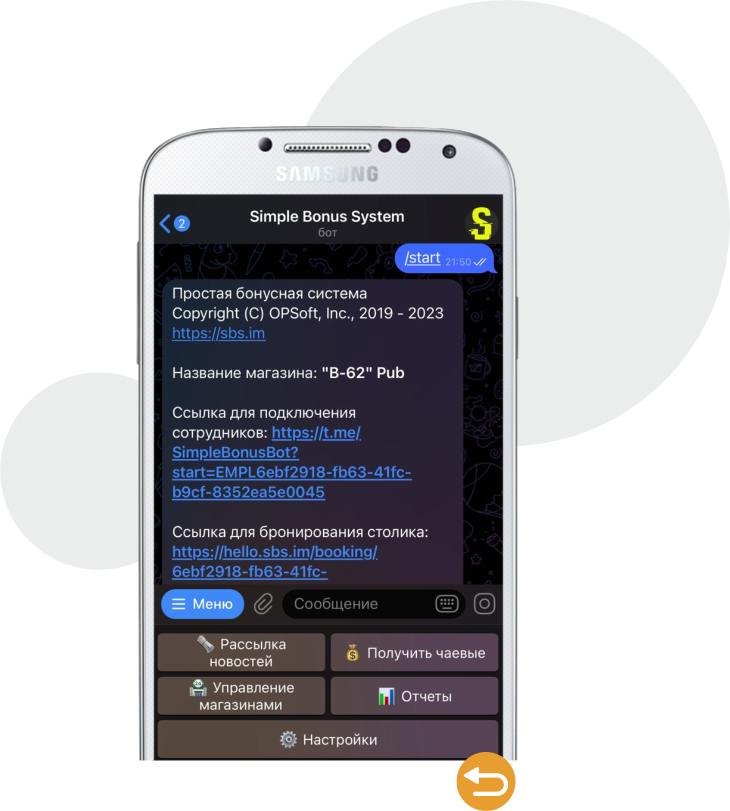Создайте собственного бота через @botfather и подключите к Простой бонусной системе. Ваши клиенты смогут видеть состояние своего бонусного счета и получать новости и уведомления